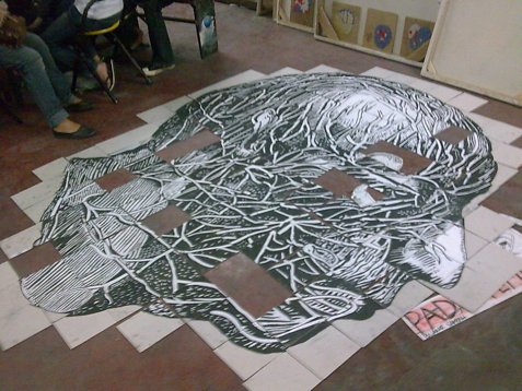 Menjiplak seluruh gambar sendirian itu sulit, tapi menjiplak hanya sebagian dari gambar bersama-sama 10 orang teman cukup mudah. Para peserta mengerjakan tugas ini sambil mendengarkan musik, ngobrol dan bercanda. Diseling jam makan siang, karya pun selesai di sore hari. Bila dilihat dari dekat, gambar-gambar ini sebenarnya tidak terlalu presisi. Selalu saja ada garis atau bidang yang tidak bertemu dengan pas di tiap kotak, tapi justru di situ keindahannya. Secara keseluruhan, citranya tetap terlihat dengan kuat dan fotografis. Gambar tulang-belulang sepasang kaki manusia ini terdiri dari 72 kotak grey-board, itu pun tidak semua terisi. Kami bekerja selama empat hari, setiap hari Senin dan Selasa. Ini adalah hasil pertemuan hari pertama.
