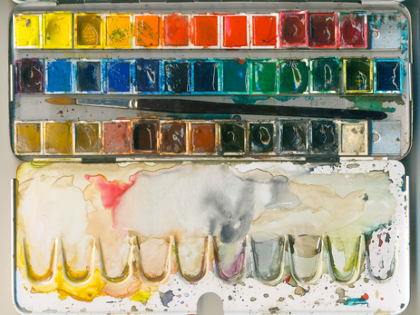 Tinta cat air akan basah lagi kalau diberi air dan tinta yang sudah mengering di wadah pencampur baik sekali untuk menghasilkanbroken colors. Kadang-kadang ketika baru mulai, saya tidak mengambil warna sama sekali dan mengambilnya hanya dari tinta kering di wadah pencampur. Warna-warna terdahulu yang terkadang berbeda dengan yang kita maksud justru menjadi campuran yang bagus. Kita selalu bisa membubuhkan warna yang kita maksud di lapisan kemudian. Dengan demikian, warna selalu tercampur dan hasilnya warna lebih matang. Untuk alasan praktis yang sama, cat air berbentuk blok juga mudah untuk digunakan karena kita hanya perlu menyediakan kuas dan air, tidak perlu membawa wadah sama sekali.