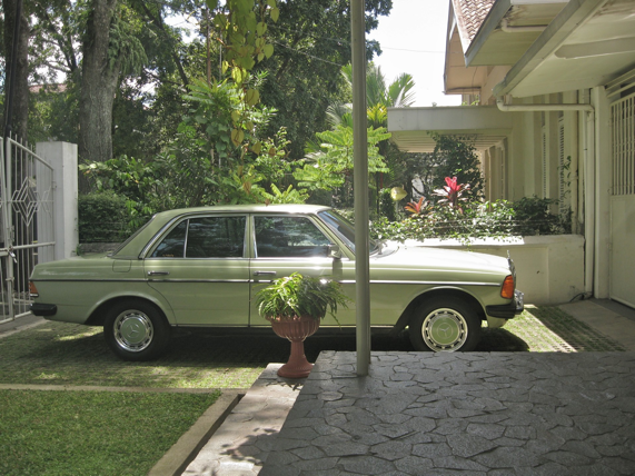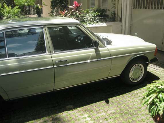 Mobil ini adalah Mercedes Benz W123, sebuah ‘Mercy Tiger’ tahun 1979 tipe 200. Mobil antik yang sudah berusia lebih dari 30 tahun macam begini sering dianggap hanya dimiliki oleh para kolektor, tapi dalam kasus saya tidak begitu. Saya bukan kolektor mobil antik dan mobil ini bukan mobil kelas pameran, saya menggunakan mobil ini untuk transportasi sehari-hari. Dia juga bukan jenis yang terbaik di kelasnya, mesinnya belum menggunakan sistem injeksi, bahkan belum menggunakan teknologi power steering. Waktu saya mendapatkannya pertama kali, tahun 2009, mobil ini sudah berlubang beberapa bagian badannya. Lubang-lubang ini diperbaiki jadi catnya sudah tidak semuanya asli, sekarang cat tambahan itu sudah kelihatan mulai memudar. Cat dof mobil, bisa dilihat di foto ini, memiliki warna yang berbeda dengan badan mobil. Mobil ini sudah pernah turun mesin karena overheat dan seperti layaknya mobil tua, perawatan yang teliti dan teratur sangat dibutuhkan. Tapi lepas dari semua kekurangannya, saya sayang sekali pada mobil ini.