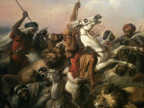 Yang menakjubkan bagi saya, karya-karya Raden Saleh begitu ‘lengkap’ dalam pengertian, dalam satu kanvas: karyanya figuratif, latar-belakangnya landscape dan pengaturan obyek dan tata-cahayanya still-life, tetapi ini bukan still-life yang diam di atas meja, ini adalah sebuah komposisi bergerak dalam sebuah narasi visual dramatis yang membeku, seperti contoh karya di atas. Dua ekor singa Afrika menyerang serombongan orang Arab bersenjata. Narasi tersebut dibuat tidak dalam posisi satu pihak akan menang, narasinya berisi ketidakpastian. Kedua pihak sedang berjuang saling mengalahkan dengan dibayangi maut bila kalah. Lembing, gigitan taring dan darah, letusan pistol, asap mesiu, jeritan panik, kemarahan dan ketakutan. Sebuah drama antara hidup dan mati. Bila kanvas adalah sebuah panggung, karya-karya Raden Saleh memang diatur sedemikian rupa sehingga mampu menampilkan dramatisasi sebuah ‘teater beku’. Menurut saya, secara komposisi, karya-karya Raden Saleh, begitu juga dengan karya-karya Romantis lain, cukup luar biasa. Kualitas seperti ini jarang sekali ditemukan di dunia seni lukis kontemporer Indonesia.