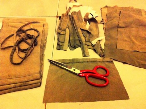 Saya terbiasa memakai kaos oblong sejak SMP jadi saya selalu punya kaos oblong yang sudah tua di lemari baju. Walaupun kadang-kadang masih nyaman dipakai, tapi sudah tidak layak pakai karena terlalu kumal, warnanya sudah memudar. UNKL, produsen kaos oblong favorit saya, menggunakan bahan yang kebetulan cocok untuk dijadikan lap melukis bila sudah tidak terpakai lagi. Kainnya bebas serat jadi tidak masalah bila digunakan untuk menggosok kanvas berlapis cat. Masalahnya, sudah beberapa kaos oblong kumal saya gunakan begitu saja, tidak dipotong-potong dahulu. Akhirnya saya selalu mencari-cari bagian mana yang masih “bersih” dan sesudah digunakan beberapa lama, kaos oblong kumal yang seringkali berwarna gelap itu nampak cukup menjijikkan. Penuh cat, lebih kelihatan kotor daripada artistik. Karena itu kali ini saya memotong-motong celana robek tersebut.