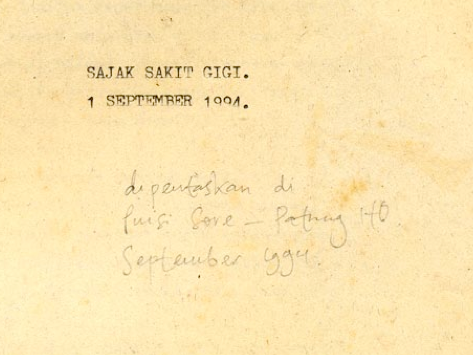 Suatu saat, selain Musik Sore, ada juga acara Puisi Sore yang diadakan teman-teman dari Studio Seni Patung dan saya diminta untuk tampil oleh kawan saya Aribowo Juliarso, teman seangkatan (1992). Bowo berjanji akan mentraktir saya kopi kalau saya mau tampil. Akhirnya saya membuat puisi khusus untuk acara tersebut. Kebetulan, sudah beberapa minggu saya sangat terganggu oleh sakit gigi. Gigi saya betul-betul rusak waktu itu, gusi saya bengkak karena perawatan yang buruk dan takut ke dokter gigi. Saya sudah minum obat penahan rasa sakit sampai kebal dan akhirnya saya menyerah. Saya pergi juga ke dokter gigi dan mimpi buruk saya pun jadi kenyataan.