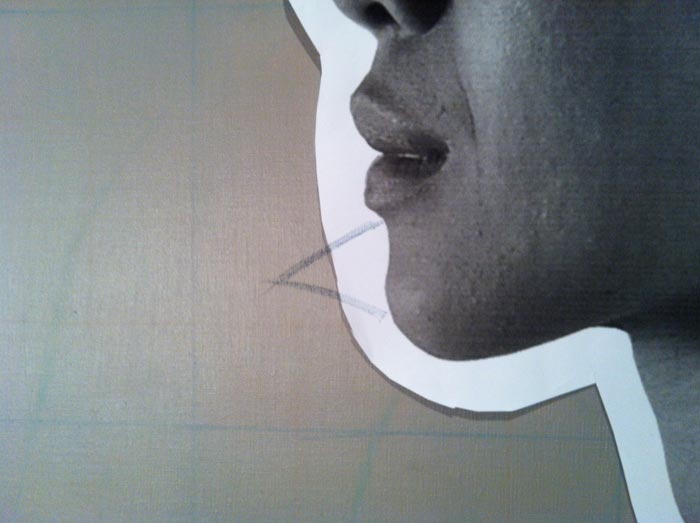 Karena rencananya saya akan membuat sebuah karya diptych (dua kanvas dijadikan satu), saya harus menyusun hasil cetakan saya supaya letaknya seimbang di kedua kanvas. Sesudah saya yakin dengan penyusunannya, hasil cetakan itu harus dilepas lagi karena itu saya beri tanda baik di gambar maupun di atas kanvas, supaya nanti kalau saya tempelkan lagi letaknya akurat.