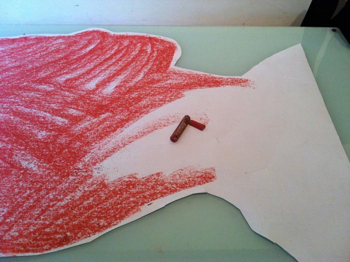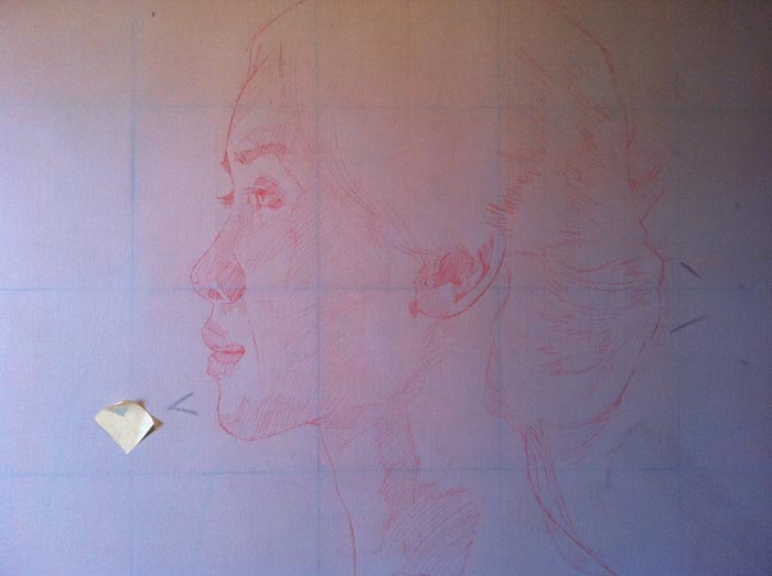 Sesudah itu saya mencopot kembali hasil cetakan, lalu menggosok bagian belakangnya dengan pastel kapur (soft pastel). Selain menggunakan pastel kapur, kita juga bisa menggunakan arang (charcoal), pensil grafit (sekitar 4B-6B) atau bahkan cat minyak (tanpa medium). Gosokan inilah kelak yang akan memberi kita hasil jiplakan. Jadi pada prinsipnya, teknik menjiplak ini serupa dengan teknik jiplak kertas karbon tapi kertas karbonnya kita buat sendiri. Unggahan lama saya tentang berbagai cara menjiplak bisa dibaca di artikel Menjiplak Foto ini. Sesudah bagian belakang cetakan saya gosok dengan merata, saya pun memasangnya kembali di atas kanvas pada posisi yang sudah saya tentukan dan saya pun siap menjiplak.