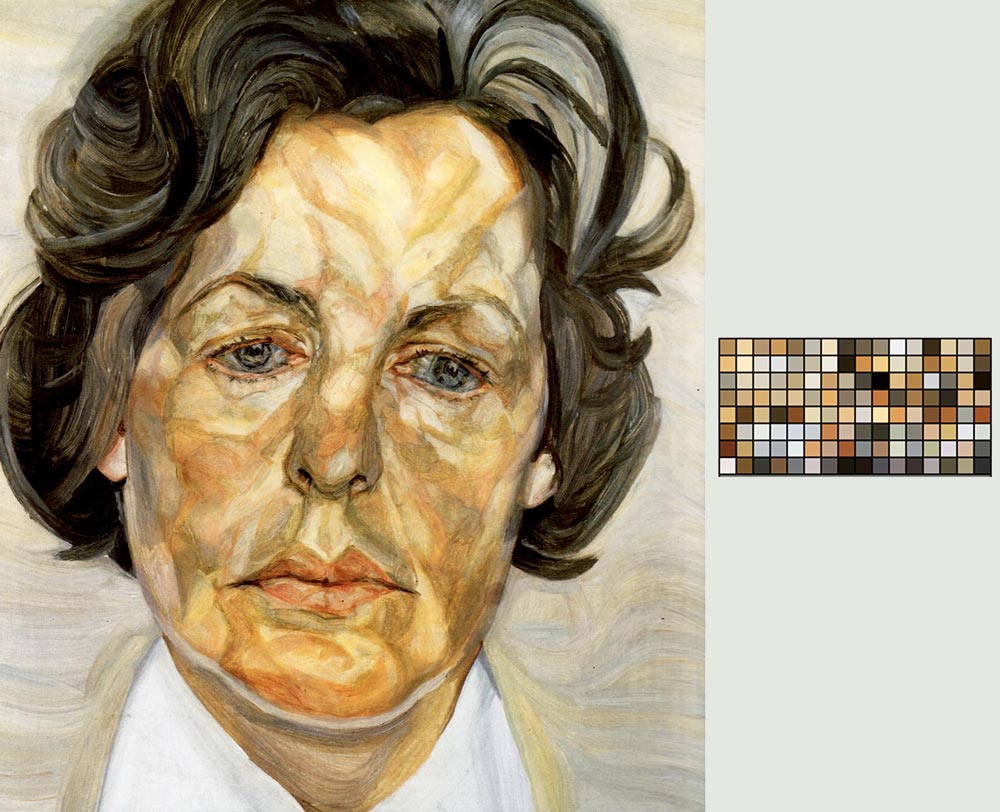 Foto digital yang Anda pilih akan menentukan komposisi warna yang diekstrak oleh Photoshop. Intinya, foto apa saja bisa Anda ekstrak warnanya. Foto-foto biasa, misalnya dokumentasi acara keluarga di ruang publik, akan berisi komposisi warna yang spektrumnya lebih luas (warnanya lebih acak thus lebih beragam) bila dibandingkan dengan spektrum warna yang dihasilkan dari foto karya seorang pelukis. Palet (pilihan warna khas) seorang pelukis biasanya memiliki spektrum warna yang lebih spesifik. Lihatlah bagaimana warna-warna dari lukisan “Woman with White Shirt” karya Lucian Freud diekstrak oleh Photoshop dalam tabel warna di bawah ini: