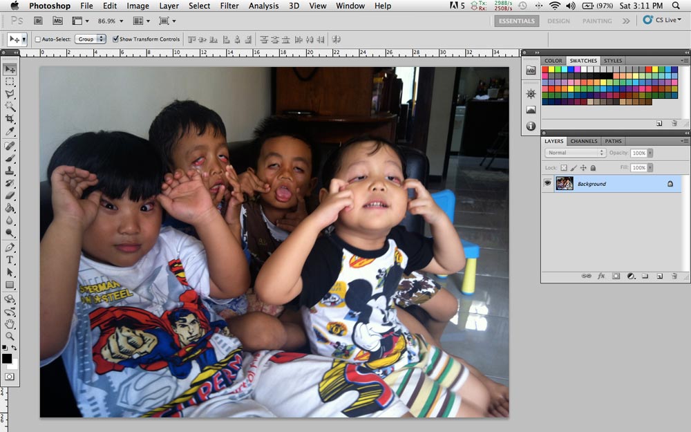 Ambil foto digital apa saja, terserah Anda, lalu buka dengan Photoshop. Dalam contoh ini saya mengambil foto anak saya dan teman-temannya di rumah.