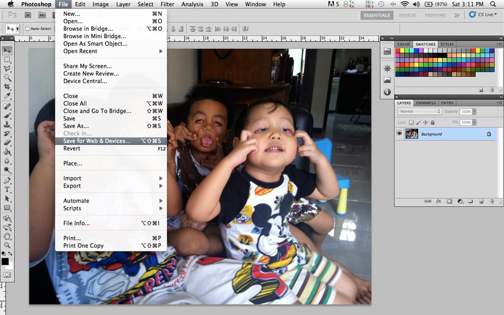 Kemudian, pilihlah menu: File lalu Save for Web & Devices…