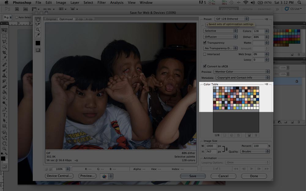 Voila! Lihatlah bagaimana Photoshop mengekstrak warna yang terdapat dalam foto digital yang saya buka dalam bagian Color Table. Anda bisa mencoba bermacam-macam pilihan GIF untuk melihat komposisi warna yang berbeda.