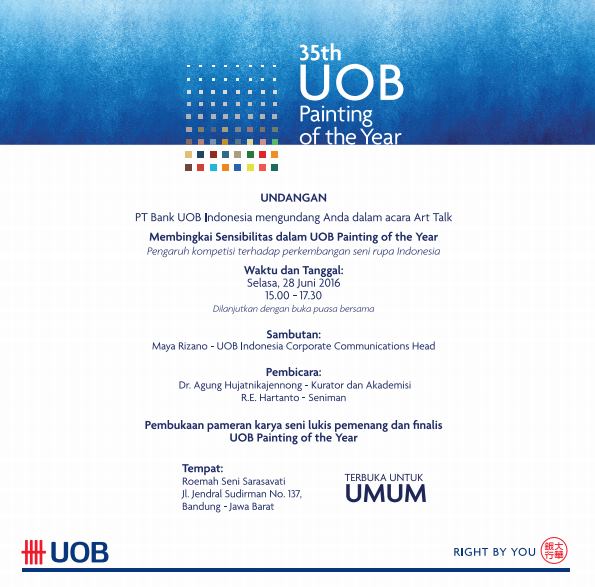 Teman-teman yang baik, seperti yang bisa dilihat pada pengumuman ini, pada hari Selasa, 28 Juni 2016, saya dan kawan baik saya, Agung Hujatnikajennong, akan jadi pembicara dalam sebuah acara diskusi yang menjadi bagian dari sosialisasi kegiatan “The 35th UOB Painting of The Year 2016”.