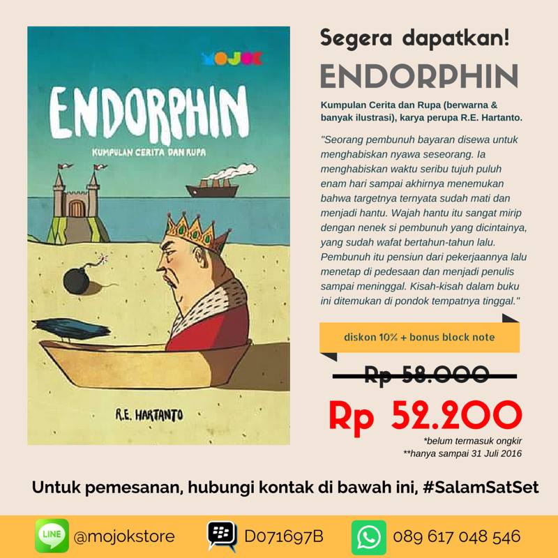 Teman-teman, terima kasih untuk antusiasme Anda semua. Pemesanan buku Endorphin sudah ditutup. Bagi Anda yang sudah memesan dengan alamat kirim di luar Pulau Jawa, mohon bersabar, saya masih ngerjain karya untuk pameran. Anda akan saya kontak via Whatsapp soal berapa ongkos kirim yang dibutuhkan.
