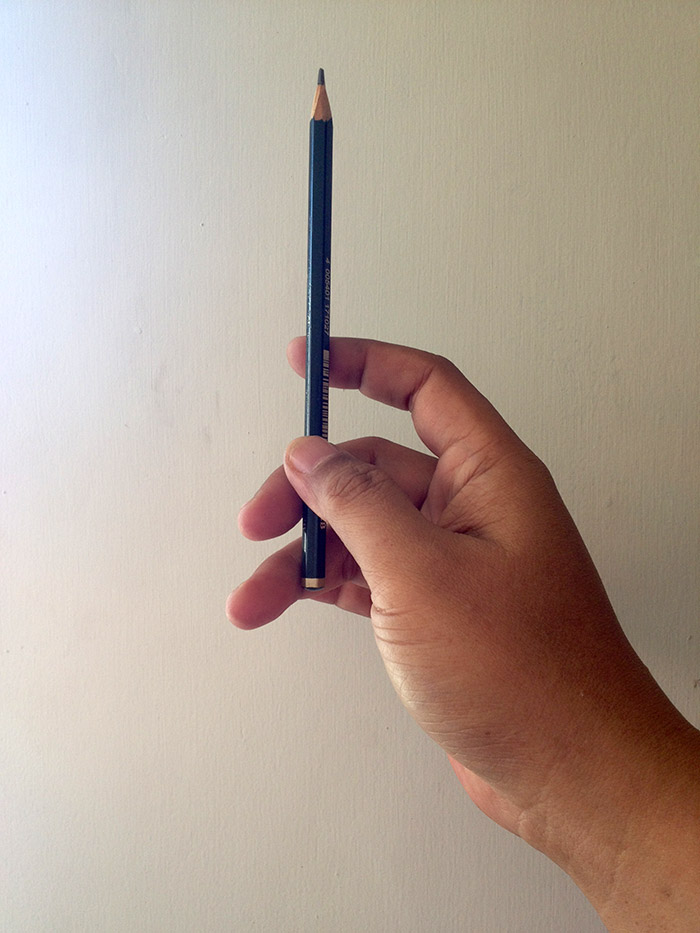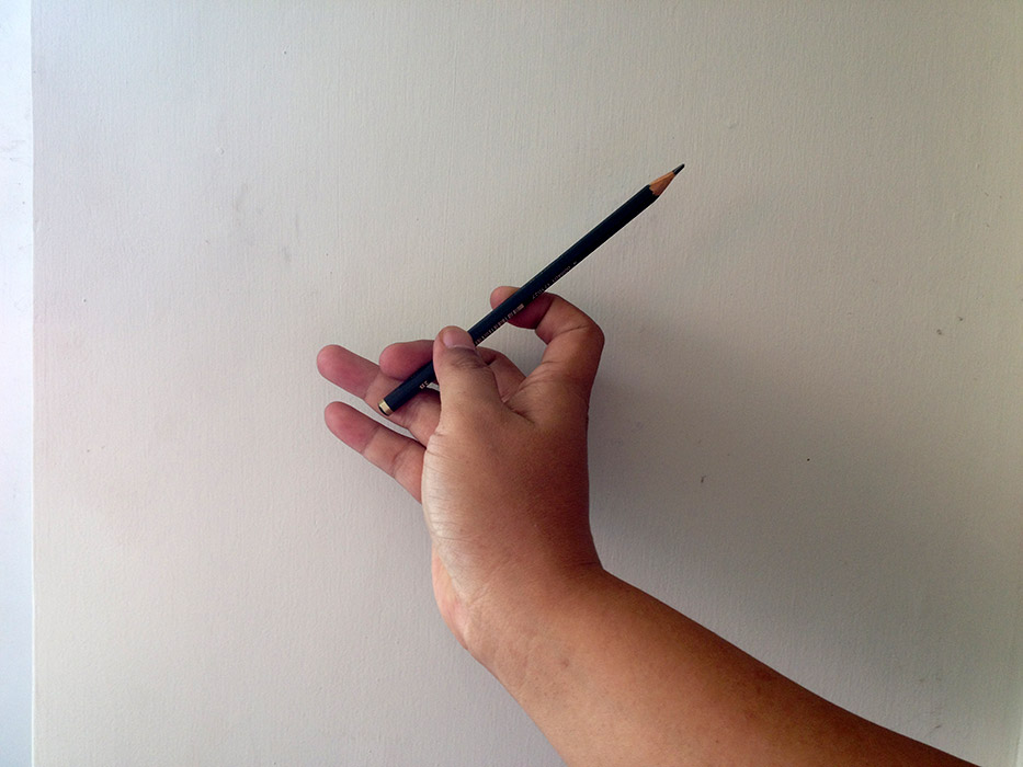3. Pegang pensil di bagian ujung belakangnya dengan menggunakan jari telunjuk, jari tengah dan jari manis, dikunci oleh jempol tangan.