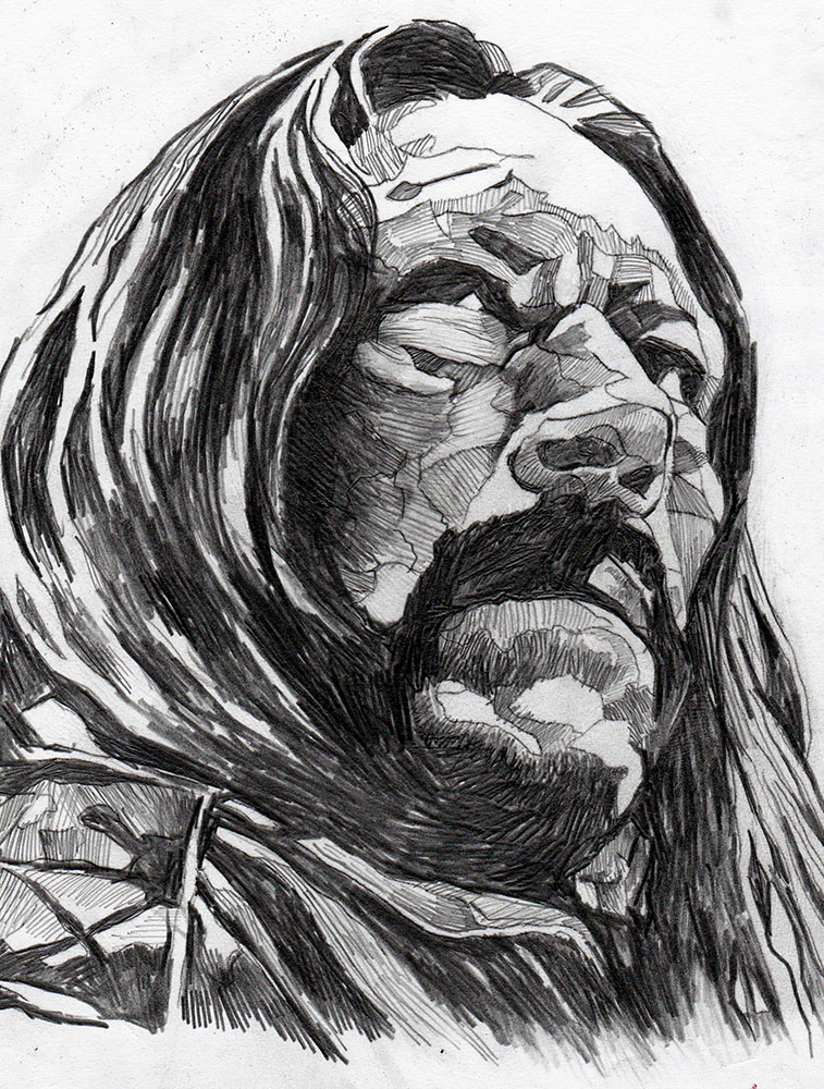 Lihatlah bopeng-bopeng dan pori-pori kulit wajah Papa yang besar-besar. Pada tataran rinci inilah wajah Papa Trejo masih cukup menantang bagi yang sudah mahir sekalipun. Jarang ada wajah yang bisa dikerjakan oleh pemula sampai yang mahir seperti ini. Karena itulah wajah Danny Trejo selalu saya gunakan sejak awal banget Klinik Rupa dr. Rudolfo berdiri dan masih digunakan sampai sekarang. Karena itulah potret Danny Trejo adalah “Papa” karena wajah ini bisa dikerjakan oleh semua, bukan oleh sebagian kalangan saja. Ada peserta yang berusaha memperhalus dan mempermanis wajah Danny Trejo. Bah! Kalau mau menggambar wajah yang halus dan manis, sih, silakan gambar wajah Dian Sastrowardoyo aja. Ingat kata Stéphane Malarmé, “Lukisan bukan soal bendanya tapi soal dampaknya.”