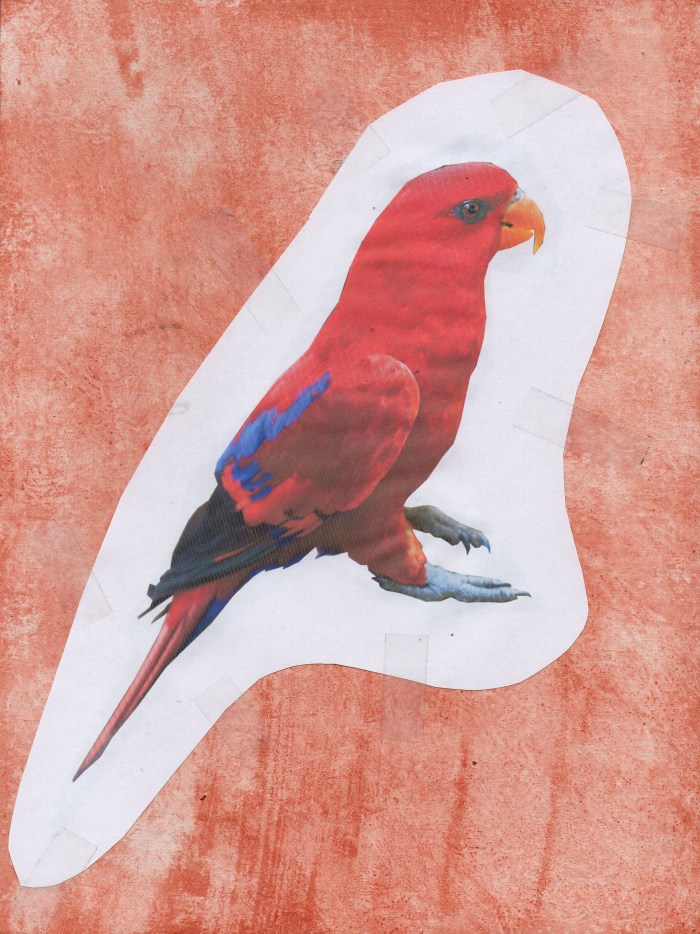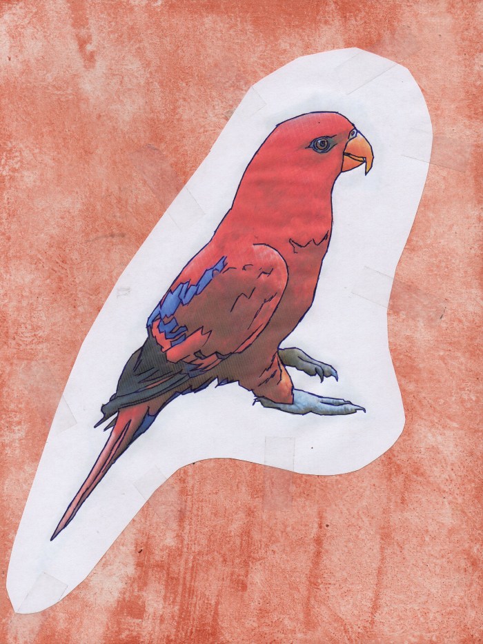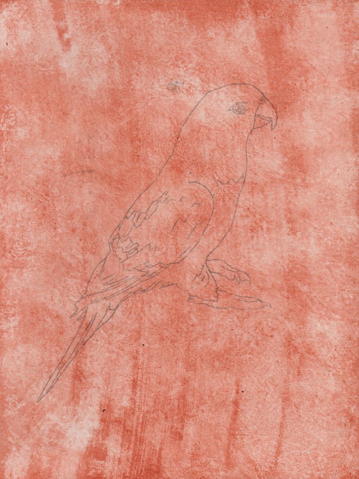 Ini adalah seekor Nuri, Eos bornea, yang berasal dari kepulauan Banda. Saya mencetaknya full color lalu kertasnya saya gunting mengikuti bentuk burung tersebut supaya saya lebih mudah membayangkan bentuknya saat menjiplak nanti. Setelah itu, saya membalik gambar tersebut dan mengarsir bagian belakangnya dengan pensil grafit.