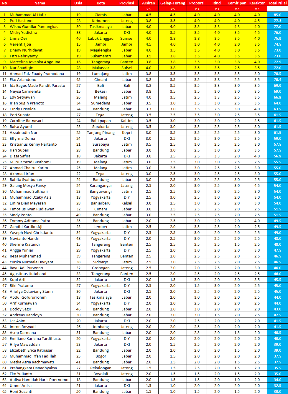 Seni rupa sulit untuk dikuantifikasi, kecuali dalam disiplin realisme. Saya hanya berani membuat lomba gambar dalam disiplin realisme saja karena dalam disiplin tersebut saya bisa memecah unsur-unsurnya menjadi klasifikasi yang lebih kecil dan membuat penilaian kualitatif. Anda bisa lihat cara saya menilai dan membahas secara mendalam lomba gambar yang saya buat dalam tautan ini: Pengumuman 10 Karya Terbaik & Pembahasan Karya Lomba Gambar Papa Trejo 2018. Cara saya menilai bisa dilihat dalam tabel di bawah ini dan saya berani jamin, tidak ada satu pun lomba gambar anak-anak yang membuat sistem penilaian seperti ini, siapapun jurinya. Soalnya gambar anak memang tidak bisa dikuantifikasi seperti ini. Kalau realisme baru bisa. Silakan klik tabel di bawah ini untuk melihatnya dalam ukuran lebih besar.