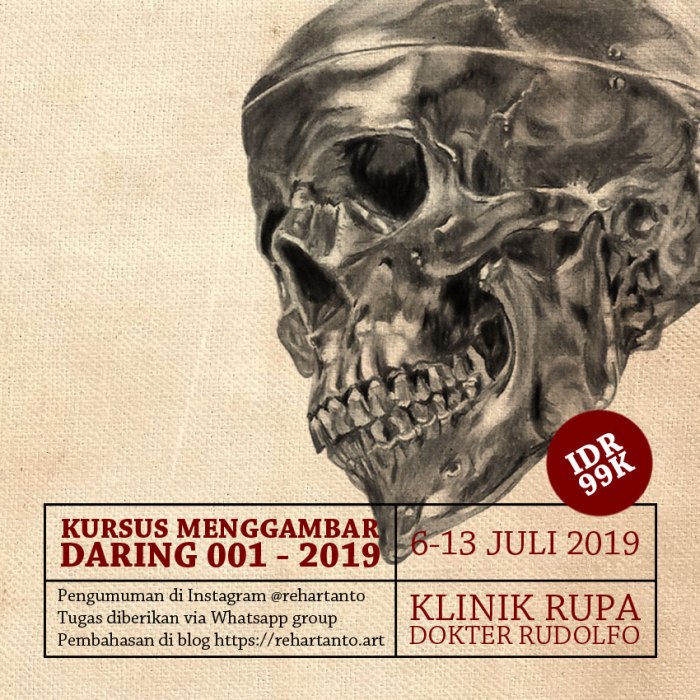 Teman-teman yang baik, pendaftaran untuk mengikuti Kursus Menggambar Daring 2019 sudah ditutup. Terima kasih untuk Anda yang sudah bergabung, semoga kursus kita menyenangkan dan berguna bagi kekaryaan kita di masa datang. Sampai bertemu di Group Materi, ya. 🙂