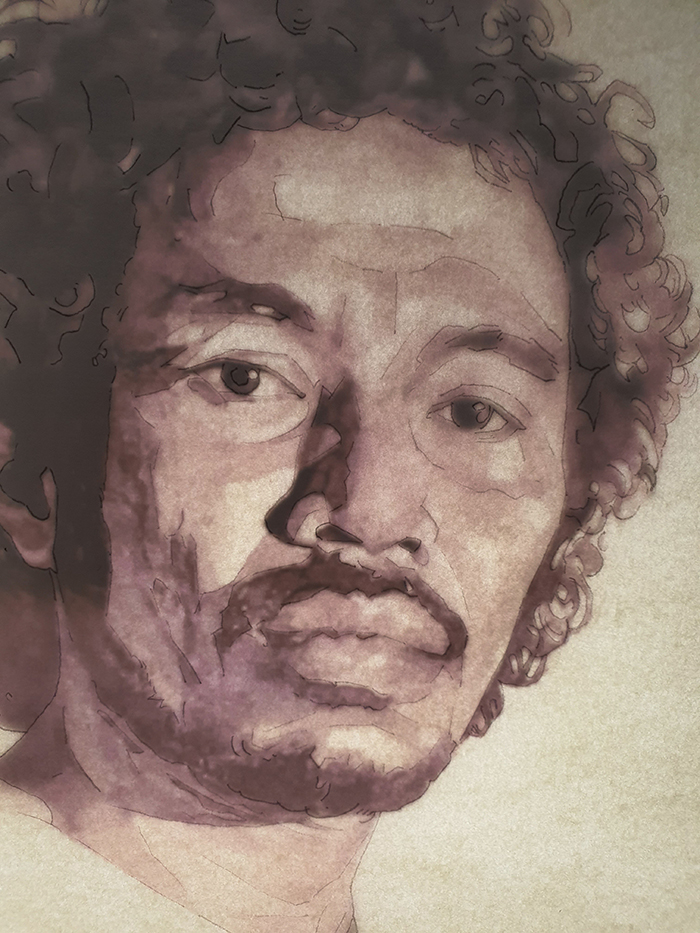 Setelah menambahkan lapisan tipis di sana-sini, juga menambahkan titik-titik, karya ini saya anggap selesai. Ini bukan karya asli, tapi karya copy. Ini adalah wajah Weslly Johannes, penyair dari Ambon, teman baik saya. Karya aslinya sudah dibingkai dan dipajang di rumah Weslly, saya membuat karya ini supaya bisa dipindai langkah demi langkah dan dijadikan materi artikel ini. Menurut saya sih karya aslinya lebih bagus. Berkarya terputus-putus karena harus memindai itu tidak enak, tapi tidak apa-apa. Anda kan jadi bisa melihat seperti apa prosesnya.