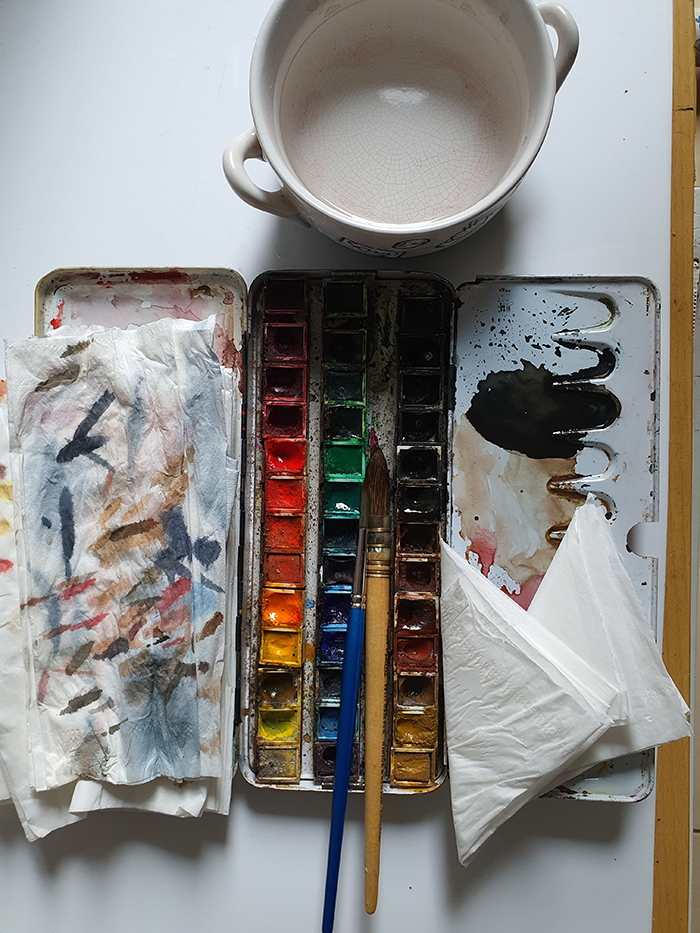 Sebelum memulai berkarya saya juga memastikan saya punya setumpuk tisu wajah yang selalu saya gunakan untuk mengeringkan atau mengurangi jumlah air pada kuas saat melukis. Anda bisa lihat di gambar di bawah ini, tisu pengeringnya belum saya ganti. Sudah ada banyak warna di situ. Bila Anda pikir tisu pengering Anda sudah terlalu kotor, ganti saja.