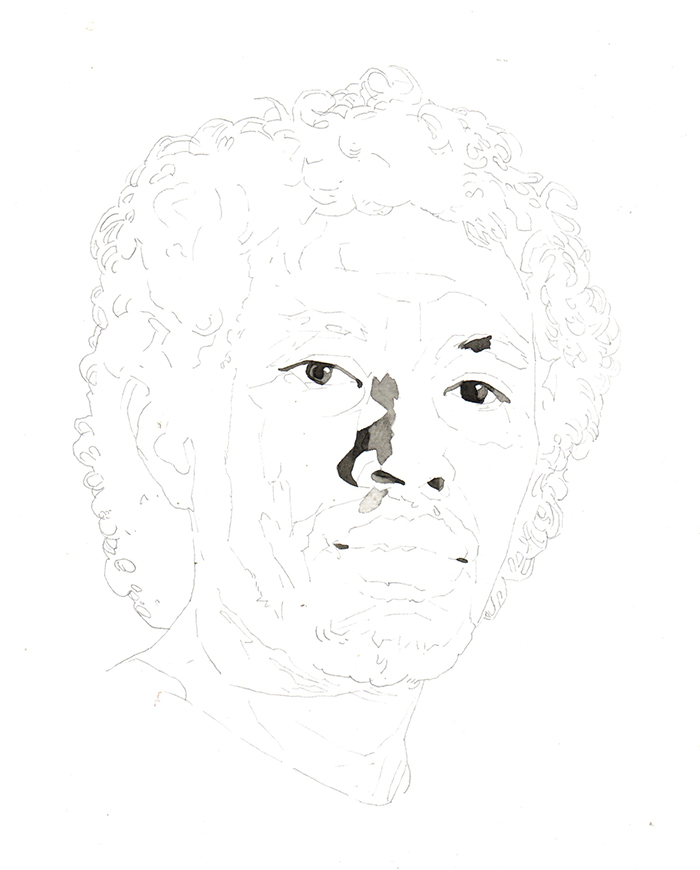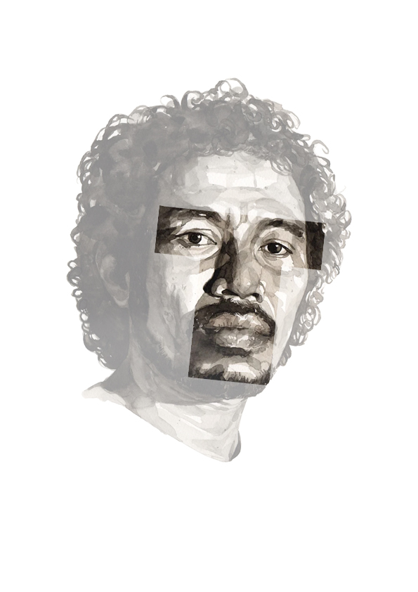 Pada tahap ini, beberapa daerah menjadi lebih terdefinisi karena ada shadow yang gelap seperti di daerah jenggot dan rambut. Walaupun begitu, unity tetap masih belum ada dan karya ini terlihat seperti coret-coret ngasal saja. Bukan masalah, lanjutkan penciptaan Anda. Tetap lakukan observasi gelap-terang dengan teliti dan campur cat Anda sedekat mungkin dengan aslinya. Jangan langsung mengulaskan di kertas cat air, periksa dulu di kertas coret-coretan. Kalau sudah yakin, barulah ulaskan di karya. Ke arah mana sapuan Anda harus menuju? Perhatikan foto acuannya. Ikuti kontur tiga dimensi dari obyeknya. Bila kita perhatikan dengan jeli, kita bisa melihat bahwa foto acuan sebenarnya memberi kita ‘saran’, harus ke mana kita mengarahkan sapuan kuas (atau arsiran, bila kita sedang mengarsir dengan pensil grafit). Perhatikan dengan jeli dan teliti, lihatlah seperti kamera sedang zoom.