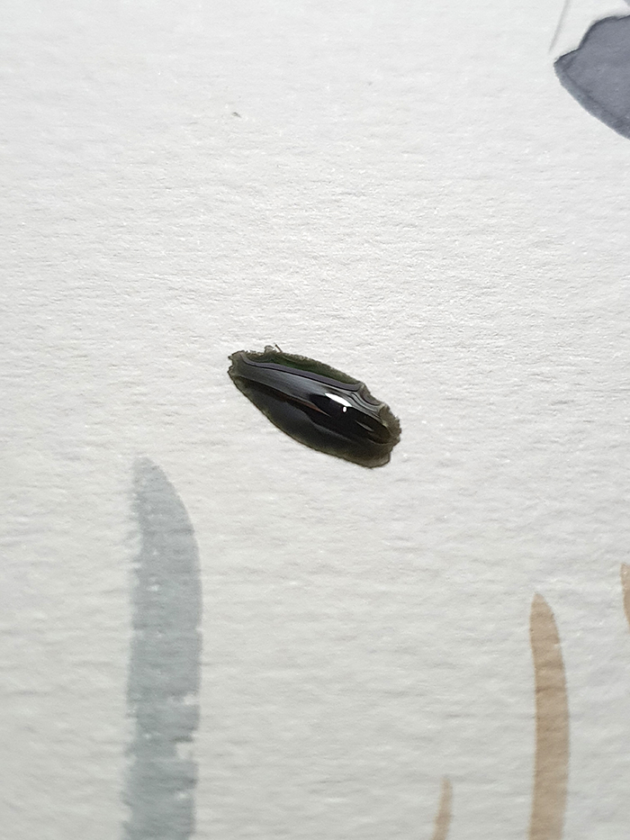 Saat melukis cat air, terutama dengan teknik wet on dry, seharusnya genangan macam ini tidak terjadi. Genangan air seperti ini makan waktu lama untuk kering sempurna dan parahnya, kita jadi tidak bisa memperkirakan akan seperti apa warnanya saat kering nanti. Saat mengulaskan kuas, cat seharusnya hanya berupa lapisan basah yang merata saja, tidak ada genangan air yang membentuk bukit kecil seperti ini.