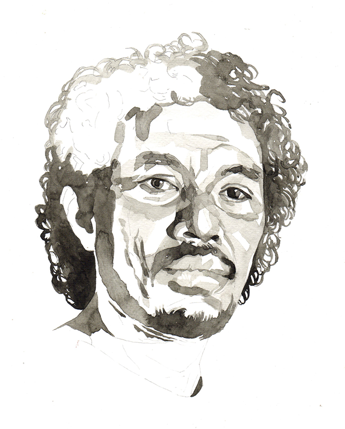 Di sini saya bergerak ke dua arah, ke arah gelap sekaligus ke arah terang. Dalam bekerja seperti ini sebenarnya tidak ada aturan baku, Anda bisa bekerja dari terang ke gelap, atau gelap ke terang, bukan masalah. Bagi saya yang penting adalah: Shadow yang paling gelap sudah didefinisi sejak awal. Kini daerah mata jadi lebih lengkap, ditambah kumis. Kumis sebenarnya cukup gelap banget, tapi tidak flat. Saya memudarkan warna kumis dengan mencuci kuas sedikit, mengelapnya di tisu pengering supaya tidak terlalu basah, lalu lanjut melukis. Dengan begitu daerah kumis tidak flat. Teknik sapuan kuas bravura sejatinya selalu menghindari suatu wilayah terlihat flat. ‘Flat’ di sini artinya ‘datar’, atau ‘ngeblok’.