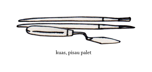 Alat-alat terakhir yang Anda butuhkan adalah kuas dan pisau palet. Karena kita akan membuat copy dari karya maestro, kita akan menggunakan teknik melukis yang halus, bukan yang kasar. Karena itu jenis kuasnya juga harus halus. Sekarang sih enak, kuas sintetis itu bagus dan murah. Dulu sih tidak begitu. Kalau mau pakai kuas halus, adanya yang jenis konlinsky sable (terbuat dari bulu binatang asli) dan harganya mahal sekali. Kuas sintetis dulu (saat saya kuliah) masih jelek. Kalau sekarang sih sudah bagus-bagus, pilihan banyak. Yang murah pun cukup bagus.