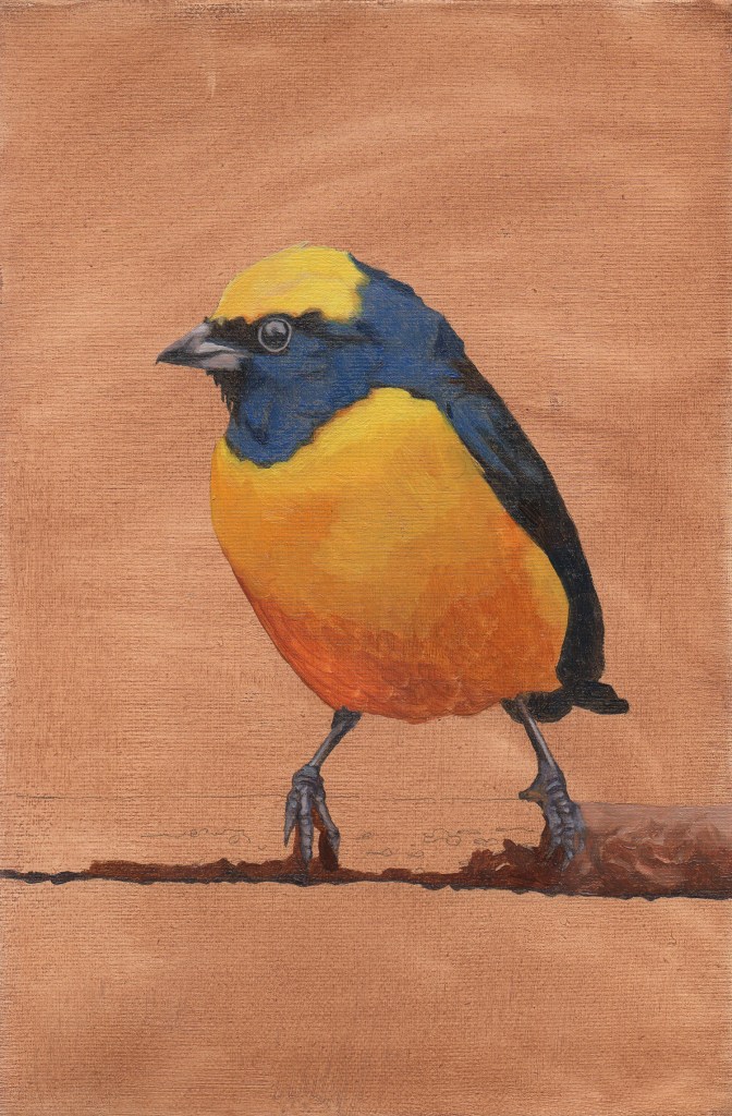 Kedua, dugaan saya terbukti. Warna titanium white dari seri Cobra Study dan Cobra Artist memang kurang legap bila dibandingkan dengan warna yang sama dari seri Van Gogh atau Rembrandt. Cobra Artist memang lebih legap daripada Cobra Study, mirip dengan Van Gogh, tapi tetap tidak bisa menyamai kelegapan Rembrandt. Anda bisa lihat bawah perut burung di atas, campuran terang berwarna oranye itu mengandung titanium white dan tidak tidak cukup legap untuk menutup imprimatura.