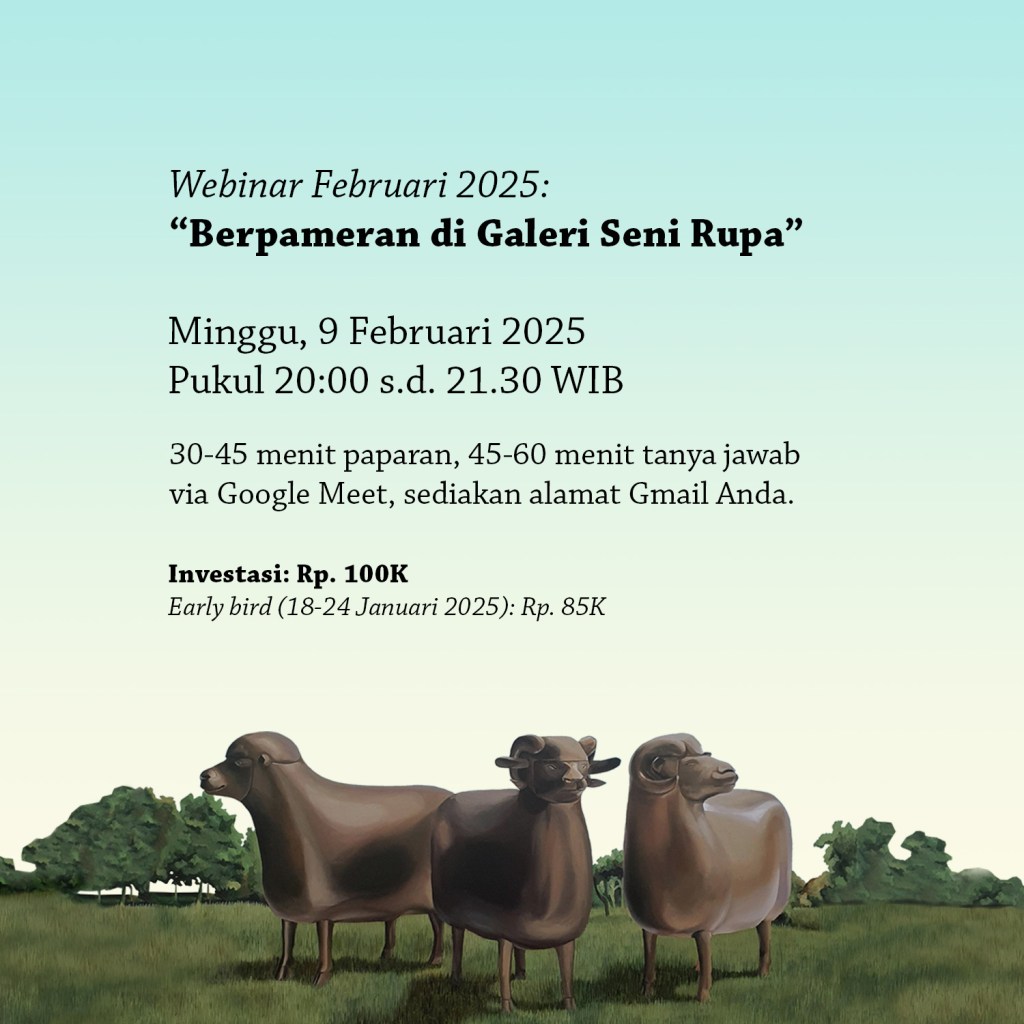 Teman-teman yang baik, di bulan Februari 2025 ini Klinik Rupa Dokter Rudolfo mengadakan webinar dengan tema “Berpameran di Galeri Seni Rupa”. Webinar akan dilakukan via Google Meet pada hari Minggu, 9 Februari 2025. Mulai pukul 20.00 s.d. 21.30 WIB.