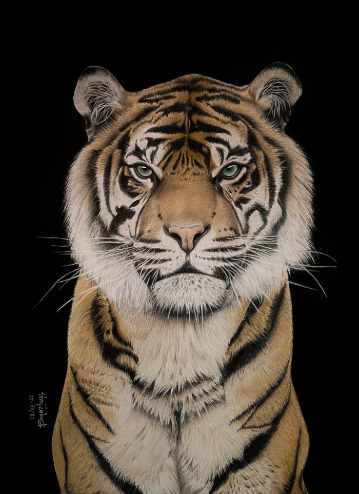 “Le Tigre”, 42 x 29.7 cm, pensil Caran d’Ache Supracolor Soft di atas kertas Canson Bristol 250 gsm. Karya Anbiya Herliyana Saadah dari Bandung. Selamat untuk Biya! πππΌ