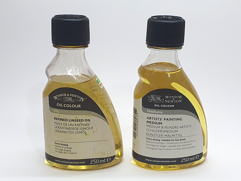 Bila perlu Anda bisa gunakan botol kaca bertutup aluminium untuk drying oil Anda, terutama bila Anda membeli dalam jumlah banyak (>250 ml). Saat melukis, tidak apa tutupnya terbuka, tapi saat jeda, tutuplah untuk mengurangi oksidasi. Jangan sampai lupa menutup sampai semalaman, ya, nanti mediumnya mengental. Anda boleh menggunakan linseed oil, tapi yang saya gunakan untuk semua instruksi di KMD004 adalah artists’ painting medium.