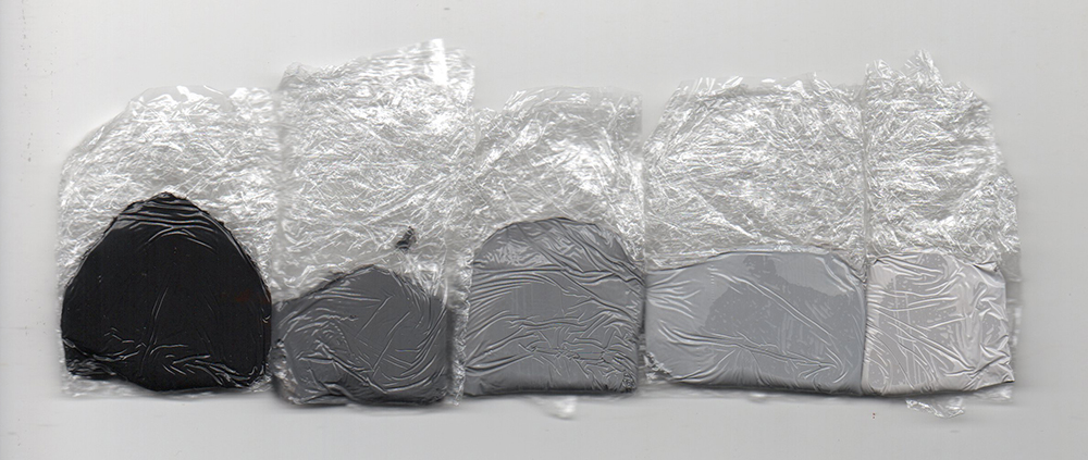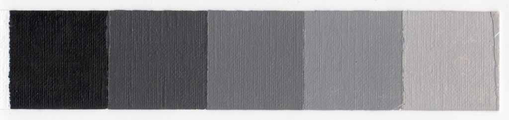 Di sini saya membuat campuran lima tahap gelap-terang, dari mulai yang paling gelap sampai yang terang. Campuran monokromatis lima tahap ini dibuat menggunakan cat minyak warna: titanium white, lamp black, dan burnt umber. Sebetulnya hanya dengan warna putih dan hitam saja kita sudah bisa membuat susunan warna yang dimaksud, tapi putih dan hitam adalah warna-warna dingin. Saya ingin memberi sedikit warna hangat, karena itu dalam campuran ini saya menambahkan burnt umber. Dengan burnt umber campuran warna saya jadi lebih kelihatan hangat dan matang.