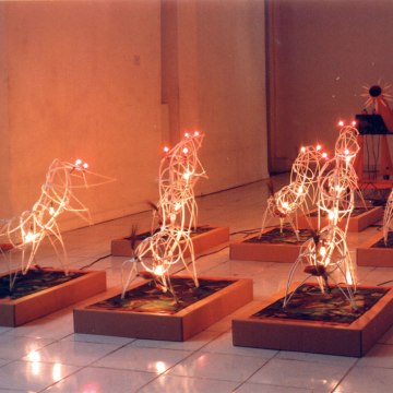 “Pagan Soldiers”, installation, dimension variable, rattan, light bulbs, woods, PVC, army camouflage clothes, 1999. Exhibition: “Media within Media”, Indonesia National Gallery, 1999