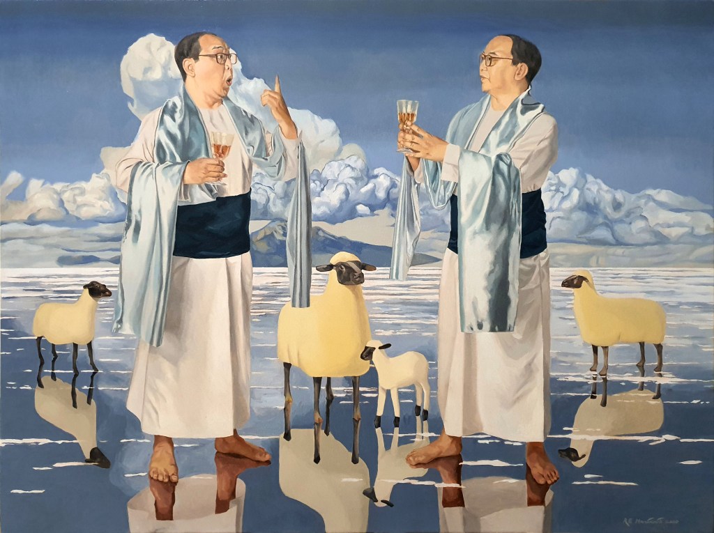 6 thoughts on ““Self Portrait as Wine Seller (Fast Rejuvenation)”, 75x100cm, oil on canvas, 2020. Art Jakarta Oppo, 2020.